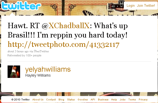 "Maneiro. RT @XChadballX: Fala aê, Brasil!!! Estou representando muito vocês hoje!" http://tweetphoto.com/41332117
